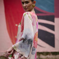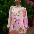 Handcrafted from luxurious bamber viscose, the dress features a stunning hand-illustrated larger than life soulful floral print with blooms in shades of pink, red and green. Delicate hand-embroidered bead-work add texture and contrast to the floral motifs. With a relaxed, flowing silhouette and three-quarter sleeves, the dress prioritizes comfort and ease-of-wear. The round neckline and side slits allow for easy movement, making it perfect for a serene resort getaway.