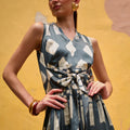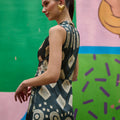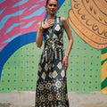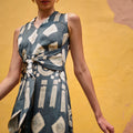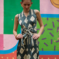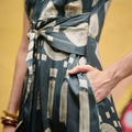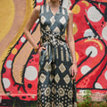 A sleeveless midi crafted in luxurious flowing bamber satin, featuring our hand-illustrated Eclipse Ikat print in earthy tones on a charcoal base. Designed with a V-neckline and a tie-knot belt that can be styled front or back, this ankle-grazing dress is an effortless classic for day-to-night wear.