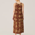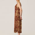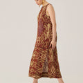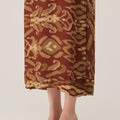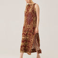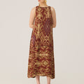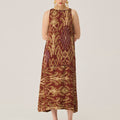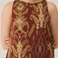 Introducing our sleeveless striking ikat print ankle-length dress in viscose georgette. With its burgundy base and earthy yellow tones, the dress exudes warmth, timelessness and style. Featuring a chic keyhole back and a single side slit, this dress offers both style and comfort. The dress features intricate hand embroidered textured beadwork details on various ikat motifs.