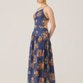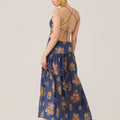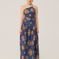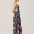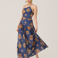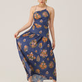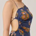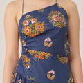 This stunning dress is crafted in soft fine cotton with a shaded block-print like motifs designed with intricate floral elements in shades of greens, pinks and oranges on a dark indigo base. The dress features a one-shoulder neckline with spaghetti straps that criss-cross at the back, a fitted bodice with asymmetrical ruching that flatters the figure, while the full-length skirt flows gracefully, making it perfect for both daytime and evening events.