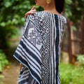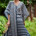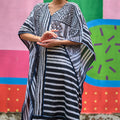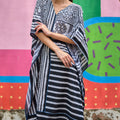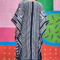 A breezy kaftan in a soft linen blend, featuring bold black-and-white ikat stripes and geometric motifs. Designed with wide sleeves, hidden pockets, and intricate contrast piping in a blue cotton, the kaftan is an effortless piece for relaxed days or chic evenings.
