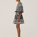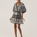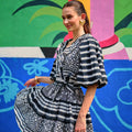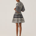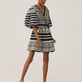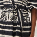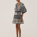 This wrap-style mini dress is crafted from lightweight and breathable cotton and combines traditional ikat patterns. The dress boasts a V-neckline, short puffed sleeves with a touch of volume, a fitted waist and a flared skirt ending just above the knee, making it ideal for both casual outings and more dressed-up occasions.