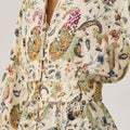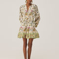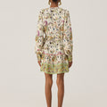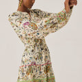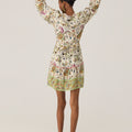 This dress is crafted from lightweight and airy viscose georgette, in a aqua coloured print on an off-white base with paisley motifs intertwined with multiple floral elements in a harmonius blend of pinks, purples, yellows and aquas The statement dress is hand-embroidered with beads, sequins, french knots in multicoloured thread and mixed materials. The dress is detailed with coloured lace on the hemline, printed hand-made fabric buttons, long sleeves with gathered cuffs and a gathered waist - the painted petals dress offers a combination of style, comfort and luxury.