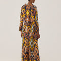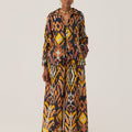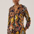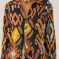 Top- The Top is designed in SiSa's hand-painted striking sunset ikat print in earthy tones with a pop of orange against a sleek black base. Handcrafted in lightweight and breathable fine cotton, the sunset ikat Top is ideal for evening cocktails, beach sunsets or relaxed evenings. The Top is designed with a classic collar, long sleeves with cuffs and a unique lace-up front detail with grommets. Pair it with matching Pants or your favorite bottoms for a complete, fun look.