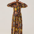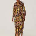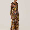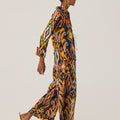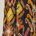 Pant- These wide-leg Pants are crafted from breathable cotton, making them perfect for warm weather and features SiSa's hand-painted striking sunset ikat print in earthy tones with a pop of orange against a sleek black base. The Pants feature pleats at the waistband, comfortable pockets and a soft elasticated back for a comfortable fit, making them easy to slip on and off. Ideal for a casual day out or a relaxed evening, these Pants combine comfort and style effortlessly.