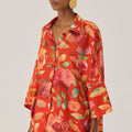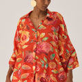 Shirt- This shirt is made from a soft fine cotton and features a bold hand-painted watercolor rose vine print, showcasing vibrant, painterly roses in shades of red, pink, and orange. The shirt is designed with a classic collar, a button-down front, relaxed fit and three-quarter length sleeves ensure comfort and ease of movement, making it ideal for both casual and semiformal occasions. Delicate coloured beads are intricately hand-embroidered on various floral motifs for texture. Perfect for pairing with trousers, skirts, or jeans, this blouse brings a burst of color and elegance to any wardrobe, making it a standout piece for any season.