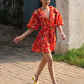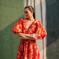 This wrap-style mini dress is crafted from luxurious cotton silk and adorned with a hand-illustrated watercolor Rose Vine print with vibrant floral motifs. The dress boasts a V-neckline, short puffed sleeves with a touch of volume, a fitted waist and a flared skirt ending just above the knee, making it ideal for both casual outings and more dressed-up occasions.